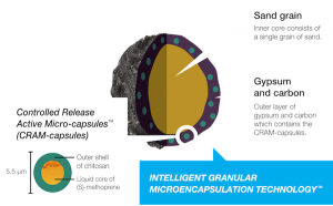 Mr Broadbent explained, “This smart technology involves coating a grain of sand with a layer of carbon and gypsum containing Ensystex’s Controlled Release Active Micro- capsules (CRAM-capsules). The CRAM-capsules are 5.5μm in diameter and consist of a natural chitosan shell protecting a liquid core of the active ingredient, (S)-methoprene. The outer chitosan shell is non-digestible by mammals, which provides further safety to non-target organisms.