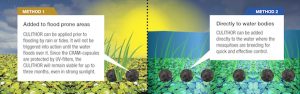 Culithor can be added directly to the water where the mosquitoes are breeding, or can be applied prior to flooding by rain or tides