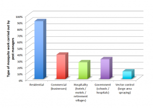 Although the majority of mosquito work was residential, between 25-35% of respondents also carried out mosquito treatments for at least one commercial (business), hospitality (hotel/motel/retirement village) or government (school/hospital) customer (Figure 3). Just over 10% of pest control companies were involved in broad-area vector control programs. The businesses with the largest number of non-residential customers were all Queensland based and all of the companies involved in vector control programs were also Queensland based.