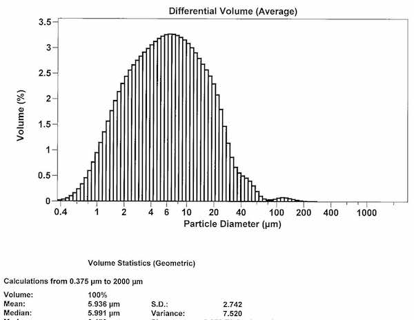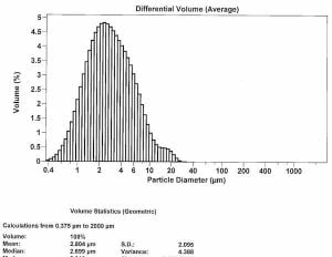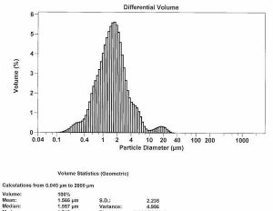 Figure 3 is another high performance product. Whilst the mean (1.6) particle size is slightly less than for the product in Figure 2, there is greater variance (4.9) in the particle sizes, with the ‘shoulders’ of the curve elongating out to higher and lower particle sizes.