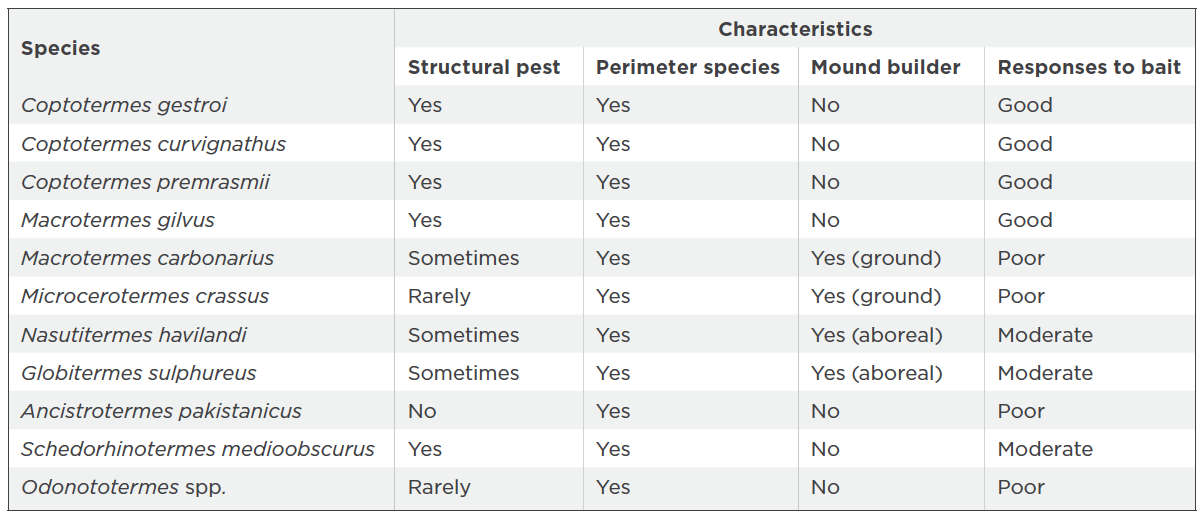 Table 1: Subterranean termite species pests in buildings and structures of Malaysia, Singapore, Thailand, and Indonesia and their responses to termite baits