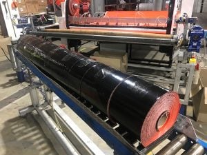 Thirdly, an engineered hot glue formulation is required to manufacture each bulk roll. The glue is supplied in drums in solid form, and needs to be melted and then pumped to the laminating enclosure. The dried webbing then reaches the laminating process, where the orange plastic is applied first. Glue heads evenly apply the glue across the webbing surface, followed by the black backing plastic at the next glue point.