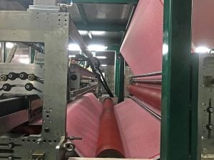 It is at this point that the machine automatically stops rolling at a pre-set distance and samples are taken for laboratory testing. The bulk roll is placed on a rack and marked as ‘quarantine’, awaiting analysis for the specified content of 2 grams/sqm deltamethrin.