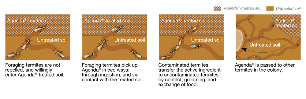 Foraging termites will not be repelled as they are unable to detect the presence of non-repellent termiticides in the treated soil when they approach a protected property. They pick up a small dose of active ingredient through ingestion or upon contact with the treated area. By not dying immediately, they transfer the active ingredient to uncontaminated termites through contact, grooming and exchange of food before they die. The active ingredient can be transferred to termites back in the colony, magnifying the effect of the treatment.