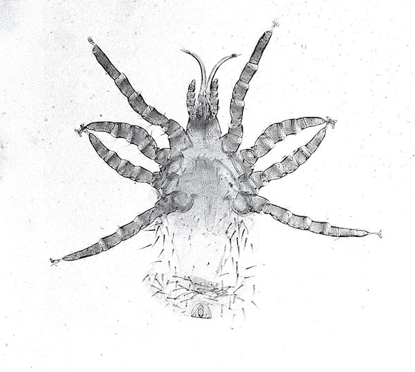 Chigger mites belong to the Trombiculidae family and are found across much of Australia. They are parasites on a wide range of animals. It is the larval stage that needs a blood meal. Not only can the bite cause irritation – hence its alternative name, the ‘scrub itch’ mite – it can transmit scrub typhus, which is a potentially fatal fever. Cases typically occur in the northern, tropical parts of Australia.