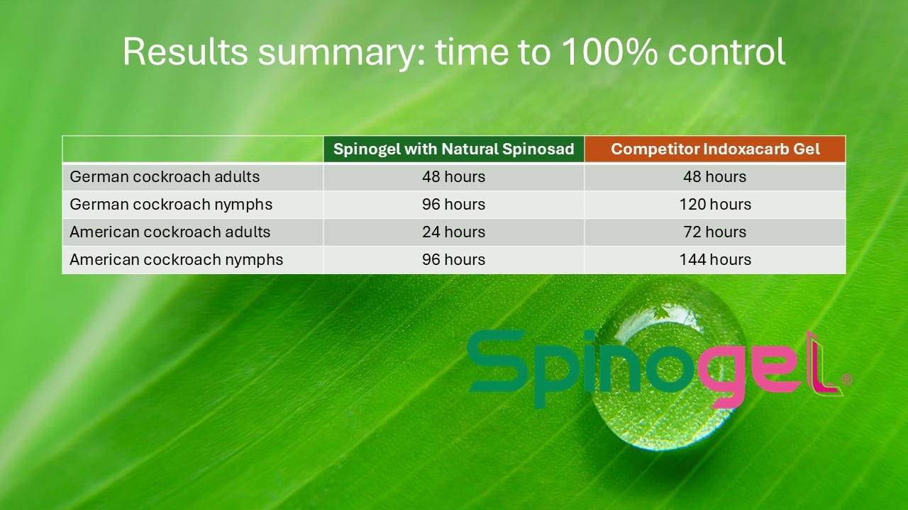 The efficacy of Spinogel Roach with Natural Spinosad was evaluated under controlled laboratory conditions using industry-standard trial methods. Researchers conducted five replicates of ten adult and nymph German cockroaches (Blattella germanica) and five replicates of ten adult and nymph American cockroaches (Periplaneta americana). Laboratory-reared cockroaches were selected to ensure uniform age, health, and genetic consistency, eliminating variability that can occur in wild populations. This provides reliable, repeatable results that accurately measure product performance under standardised conditions consistent with professional pest management research protocols.