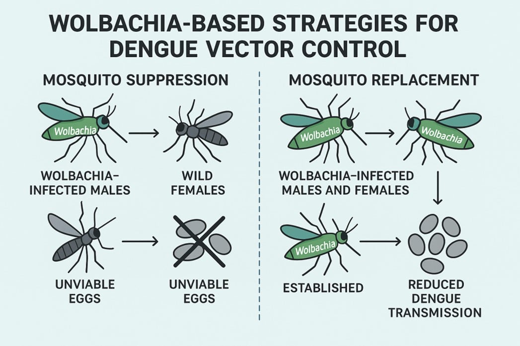 The population replacement approach has proven to be well suited for long-term, sustainable reduction where stable Wolbachia establishment is feasible. Replacing a wild population with a dengue-free, lab-reared population offers lasting benefits by stably reducing both mosquito longevity and vector competence.