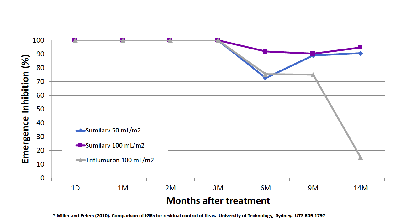 Pyriproxyfen (Sumilarv) is one of the most well studied JHMs. Research has demonstrated that it works on all life stages of the flea, and actually kills the larvae. Indeed, the lethal concentration to kill flea larvae is some 5-6 times lower than fipronil. Being active at such low concentrations and very stable allows Sumilarv to provide long residual performance, as demonstrated by the trial recording a 90% reduction in flea egg hatch, for a year or more on carpet (Figure 1).