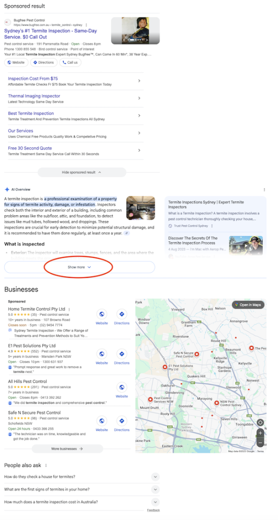 Using “termite inspection” as a search term, the initial search results show an advert at the top of the page, followed by an AI overview, followed by local pack results (inside which there is a paid position), followed by ‘People also ask’ questions and finally (off the bottom of the screen), are the organic search results (Figure 1).